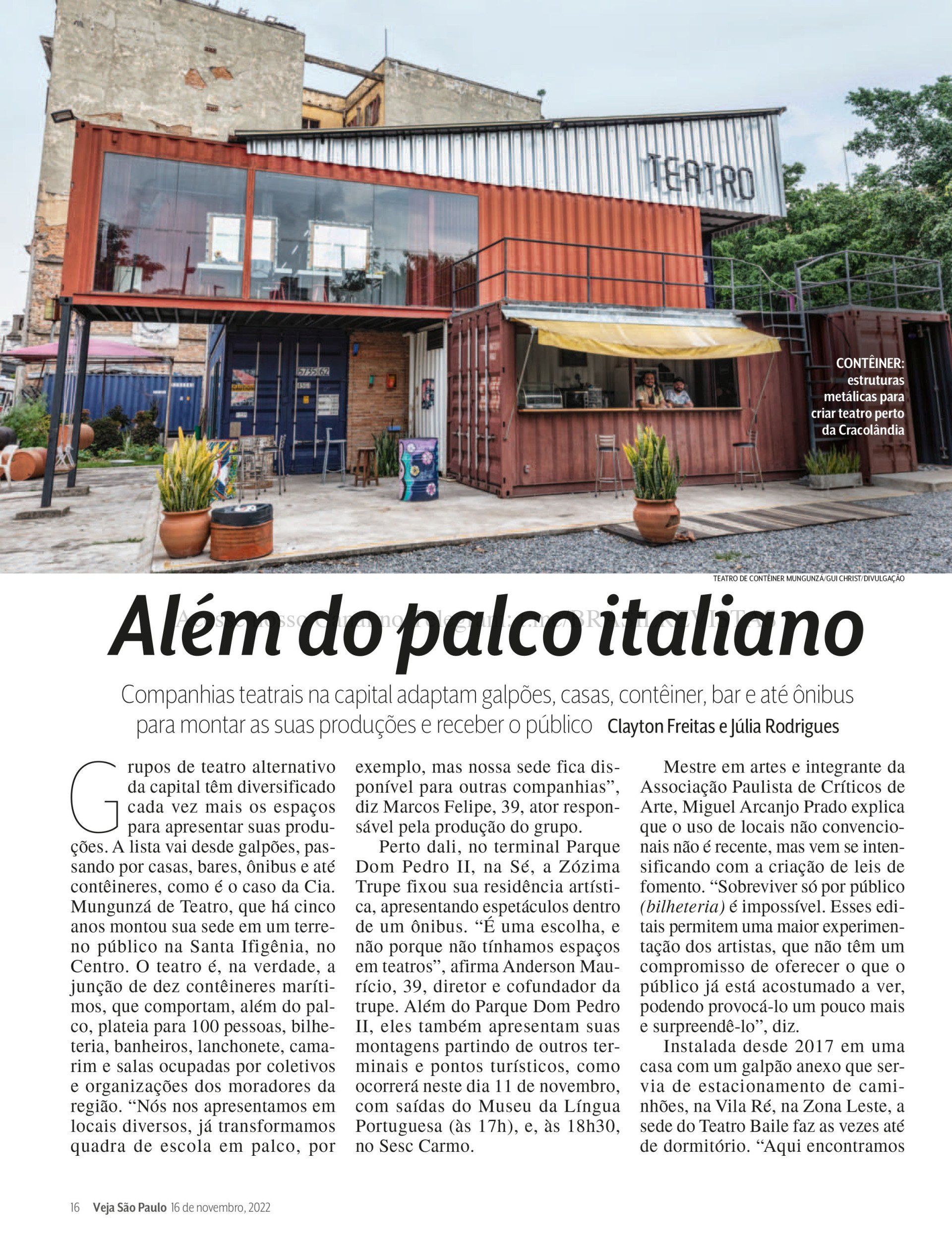No dia 16/11/22, o Teatro de Contêiner Mungunzá foi destaque na revista Veja SP.