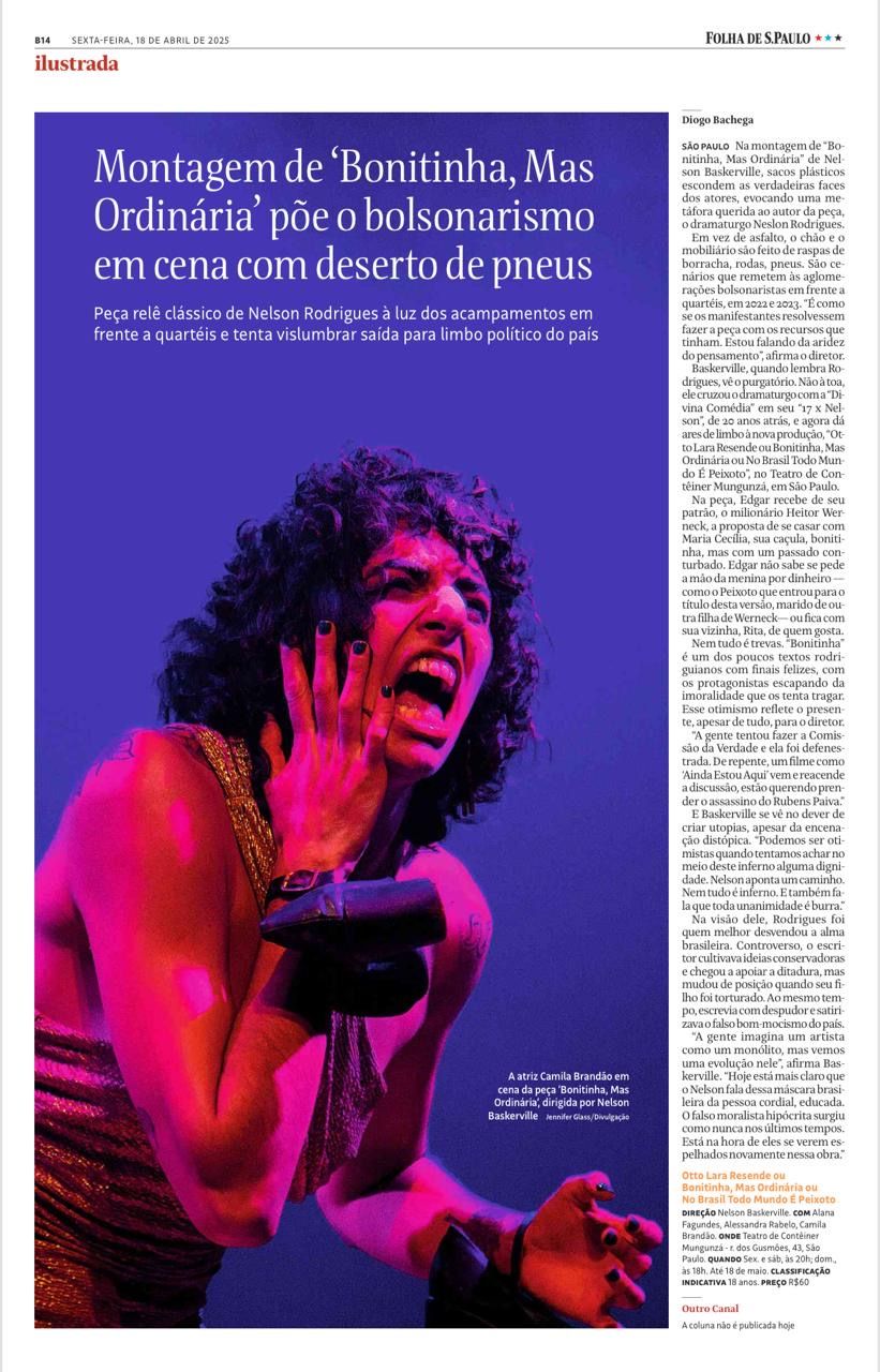 Na distopia criada por Nelson Baskerville, “Otto Lara Resende ouBonitinha, mas Ordinária ou No Brasil Todo Mundo é Peixoto” ressurge como um espelho cruel das hipocrisias brasileiras, amplificadas pelo recente avanço da extrema direita. Em um cenário sufocante de pneus e borracha, figuras mascaradas simbolizam uma sociedade corrompida pelo poder e pela aparência.Edgard, um homem marcado pela miséria apesar de anos de dedicação ao patrão Werneck, recebe uma proposta tentadora: casar-se com Maria Cecília, jovem rica e "bonitinha" , mas envolta em um passado controverso. O dilema entre dinheiro e moralidade o arrasta por um universo de desejos reprimidos, traições e valores distorcidos.A música ao vivo embala sua jornada, pontuando a ironia e o desencanto dessa tragédia cotidiana. Entre promessas de ascensão social e a herança ética deixada por seu pai, Edgard precisa decidir se o preço do luxo vale o abandono da própria dignidade.